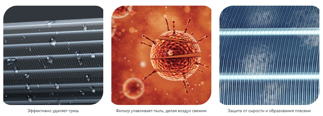 На испарителе используется гидрофильное покрытие. Когда вы нажимаете на кнопку самоочистки на пульте, поверхность испарителя быстро охлаждается и покрывается инеем — расширяясь и замерзая, влага выталкивает с поверхности трубки всю накипь и грязь. Затем кондиционер также быстро нагревается, иней смывается, а испаритель остается чистым и абсолютно сухим — без неприятных запахов и бактерий.